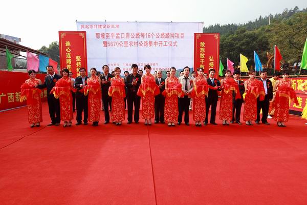 為貫徹落實自治區黨委、政府在全區掀起項目建設新高潮的決策部署,沖刺第四季度,完成全年公路建設目標任務,自治區交通運輸廳于11月3日舉行全區公路路網改造項目集中開工儀式。由集團公司承辦的分會場——那坡至平孟口岸公路等16個公路路網項目暨5670公里農村公路集中開工儀式在百色市那坡縣德隆鄉隆重舉行。自治區交通運輸廳紀檢組長、廳黨組成員朱名勝,百色市市委常委、政法委書記周武紅,市人大常委會黨組成員黃五同,集團公司黨委書記、董事長朱堅和、總經理李定倫、黨委副書記張友坐、副總經理劉明洪、總工程師覃炳賢,自治區公路管理局、百色市公路管理局、交通運輸局、那坡縣四家班子、集團公司直屬各單位領導及有關部門負責人等出席開工儀式。
