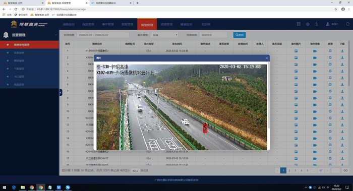 此前,工作人員對路面進行安全排查只能通過監控巡查和人工巡查兩種方式,花費的時間長、成本高,發現問題的速度慢。如今,安裝了人工智能事件檢測報警系統,一旦有行人或動物進入到高速路上、車輛不規則行駛或者路面出現拋灑物、垃圾等障礙物,監控中心智慧高速平臺上便會自動彈出檢測報警視頻和圖片。該系統不僅能提升巡查效率,減輕巡檢人員的壓力,還能讓監控員迅速掌握路況信息,從而根據事跡情況做出相應的響應。